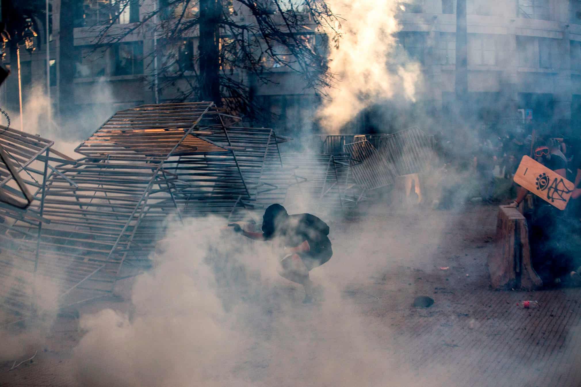 Santiago, Chile - Những người biểu tình đụng độ với cảnh sát ở thành phố Santiago trong các cuộc biểu tình mấy tháng qua, chống lại việc chính phủ của ông Sebastián Piñera trong việc tăng giá vé xe điện.