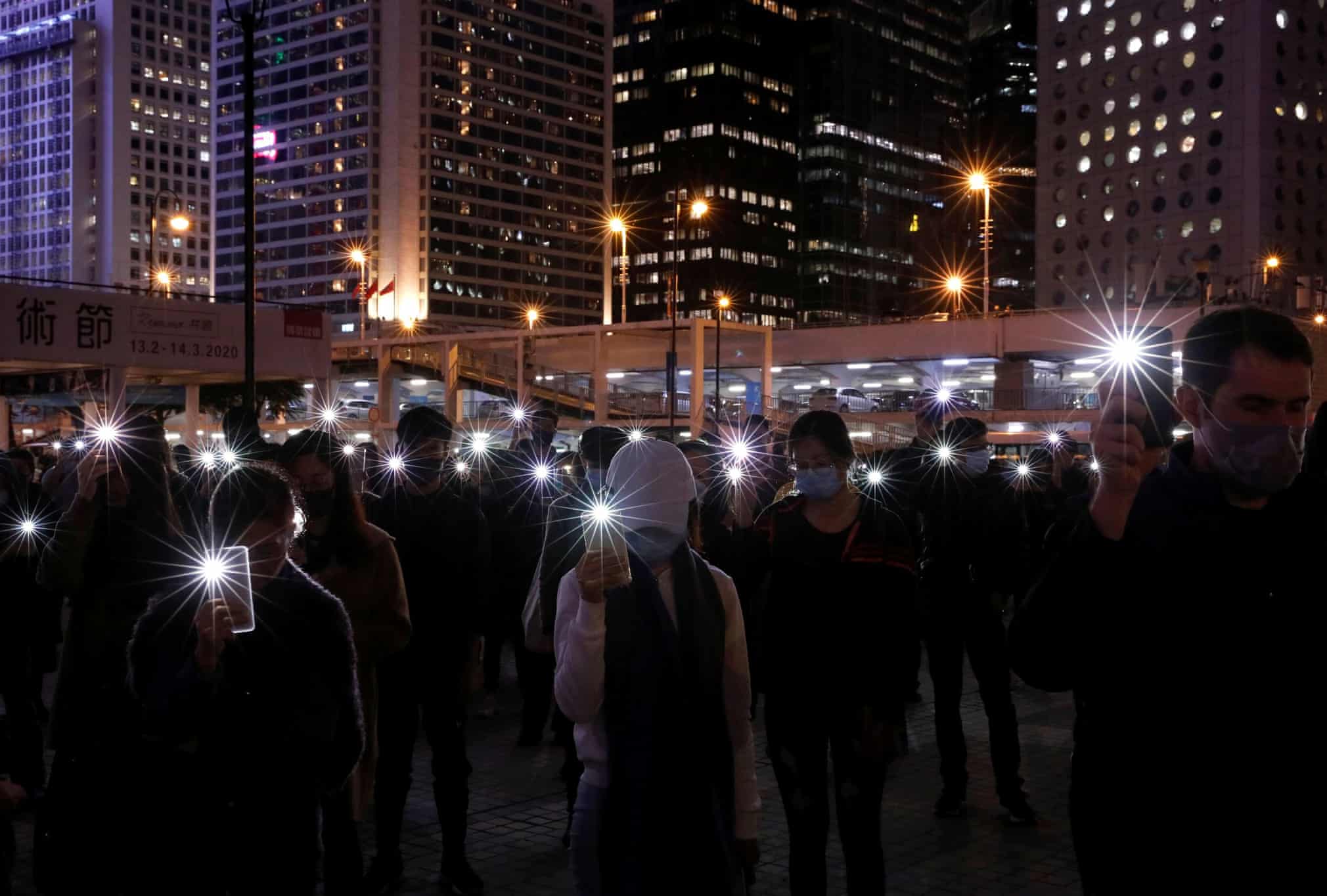 Hong Kong - Những người biểu tình chống chính phủ dùng đèn của điện thoại di động trong đêm biểu tình ở khu Edinburgh Place.