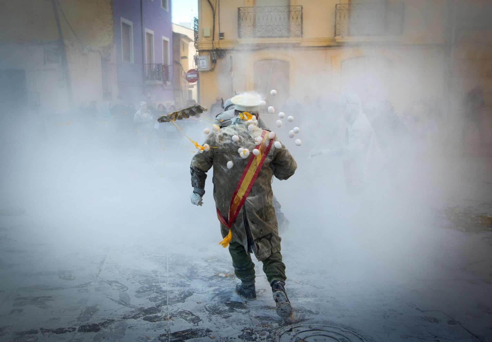 Ibi, Spain - Dân chúng mặc quần áo lính với vũ khí là trứng, bột và pháo để diễn lại trận chiến Els Enfarinats trong ngày lễ hội "Day of the Innocents - Ngày của những người vô tội."