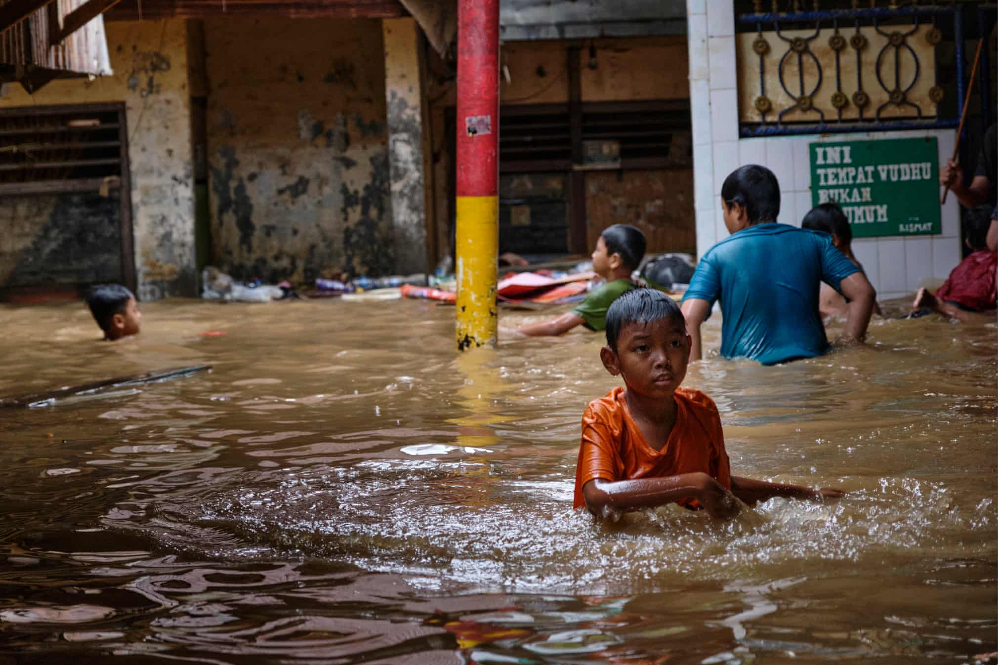 Jakarta, Indonesia - Trẻ em đang lội nước ở khu phố đang bị ngập lụt ở Jakarta. Chính phủ Indonesia cố dùng kỹ thuật "cloud seeding (phun bụi vào mây để gây mưa)" để tránh những cơn mưa đang kéo về thủ đô, đã làm thiệt mạng 43 người vì nước lũ và đất lở. Nha khí tượng cho biết sẽ còn rất nhiều cơn mưa sẽ đổ xuống trong những ngày xắp tới.
