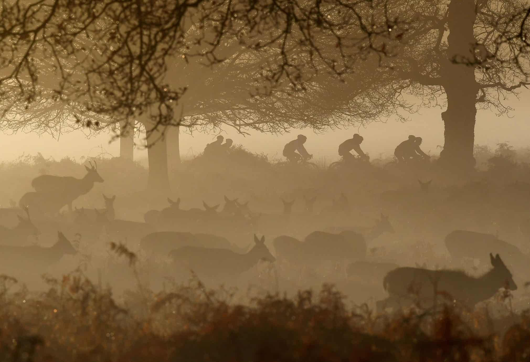 London - Những con nai đang gặm cỏ và những người đi xe đạp trong một sáng sương mù ở công viên Richmond.