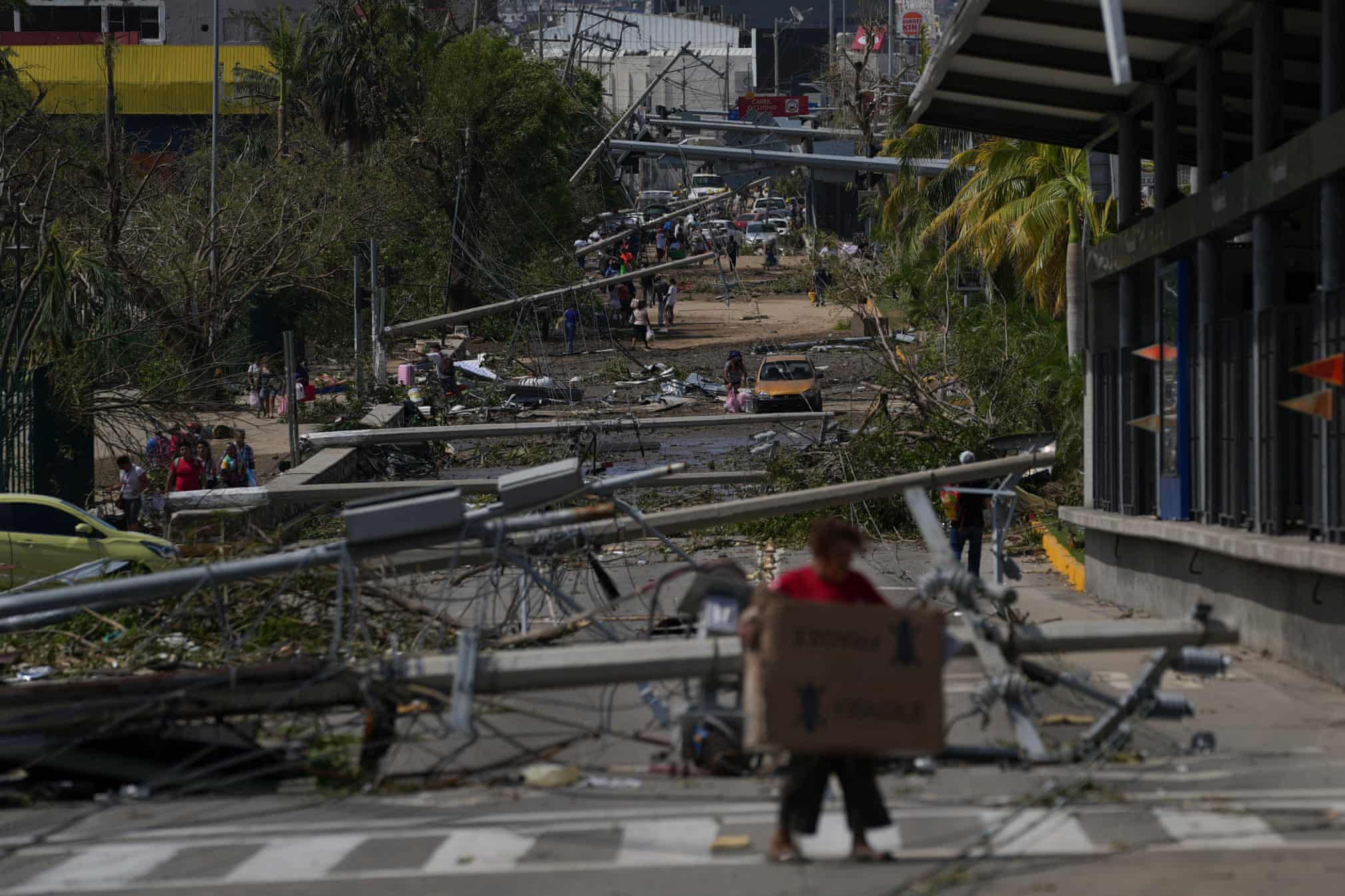 Acapulco, Mexico - Quang cảnh đổ nát của một khu đường phố sau khi cơn bão Otis quét qua Acapulco. Cơn bão, cấp 5, quét qua thành phố nghỉ mát của Mexico, phá hủy nhà cửa, khách sạn, bệnh viện và để lại dấu vết tàn phá trên đường phố. (Ảnh: Félix Márquez/AP)