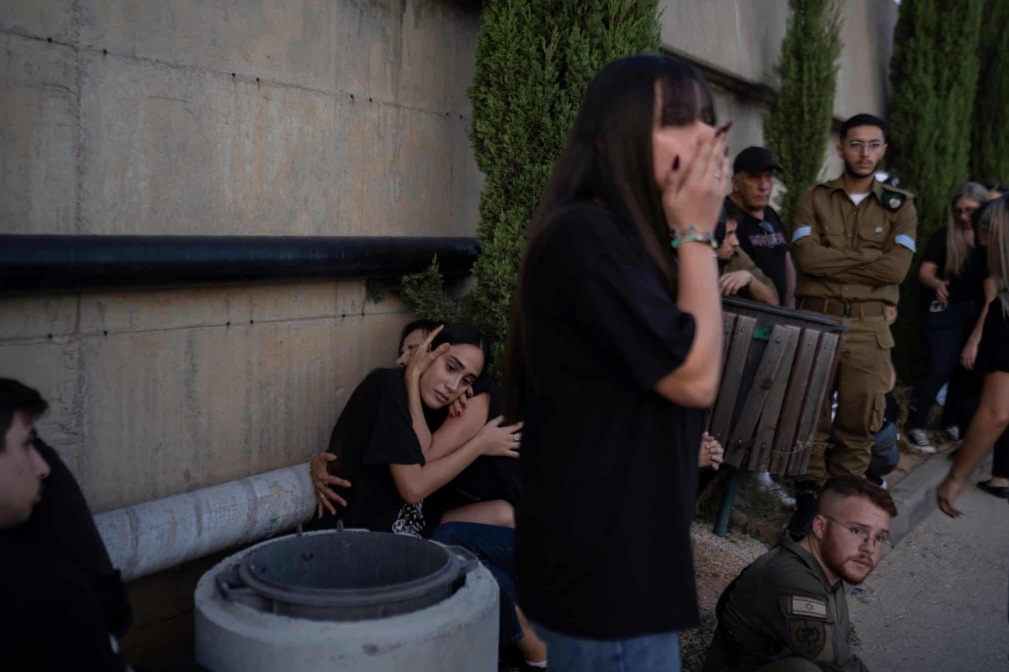 Holon, Israel - Người Israel phản ứng khi còi báo động về phi đạn đang bay tới từ Dải Gaza trong tang lễ của Sagiv Ben Svi, người đã bị phiến quân Hamas giết chết. Các cựu nhân viên quân sự, chính trị và tình báo Israel đã bày tỏ nghi ngờ về khả năng lãnh đạo của thủ tướng Benjamin Netanyahu, khi cuộc tranh luận nổ ra trong nước về phản ứng trước các cuộc tấn công của Hamas vào ngày 7 tháng 10 khiến 1.400 người Israel thiệt mạng. (Ảnh: Petros Giannakouris/AP)