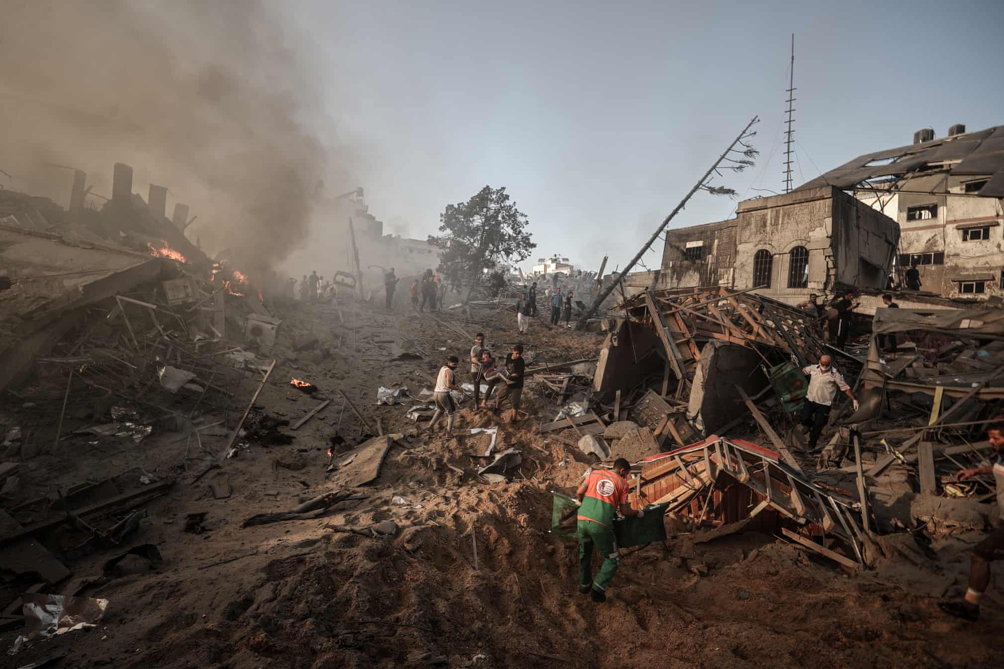 Gaza City - Các đội dân phòng và dân thường đang tìm kiếm nạn nhân trong các tòa nhà bị hư hại nặng nề sau các cuộc tấn công của Israel (Ảnh: Ali Jadallah/Cơ quan Anadolu/Anadolu/Getty Images)