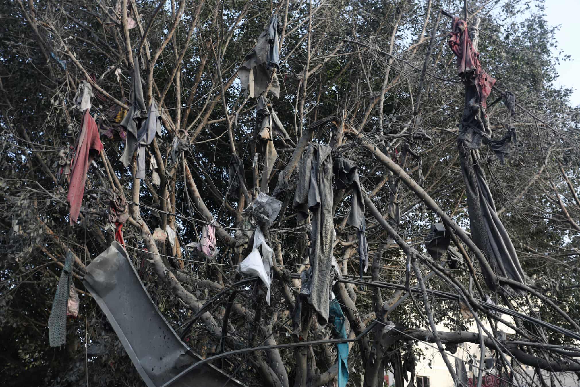 Rafah, Dải Gaza - Những mảnh vải vương vãi trên các cành cây là những gì còn lại sau cuộc không kích của Israel (Ảnh: HHR Ali/AP)