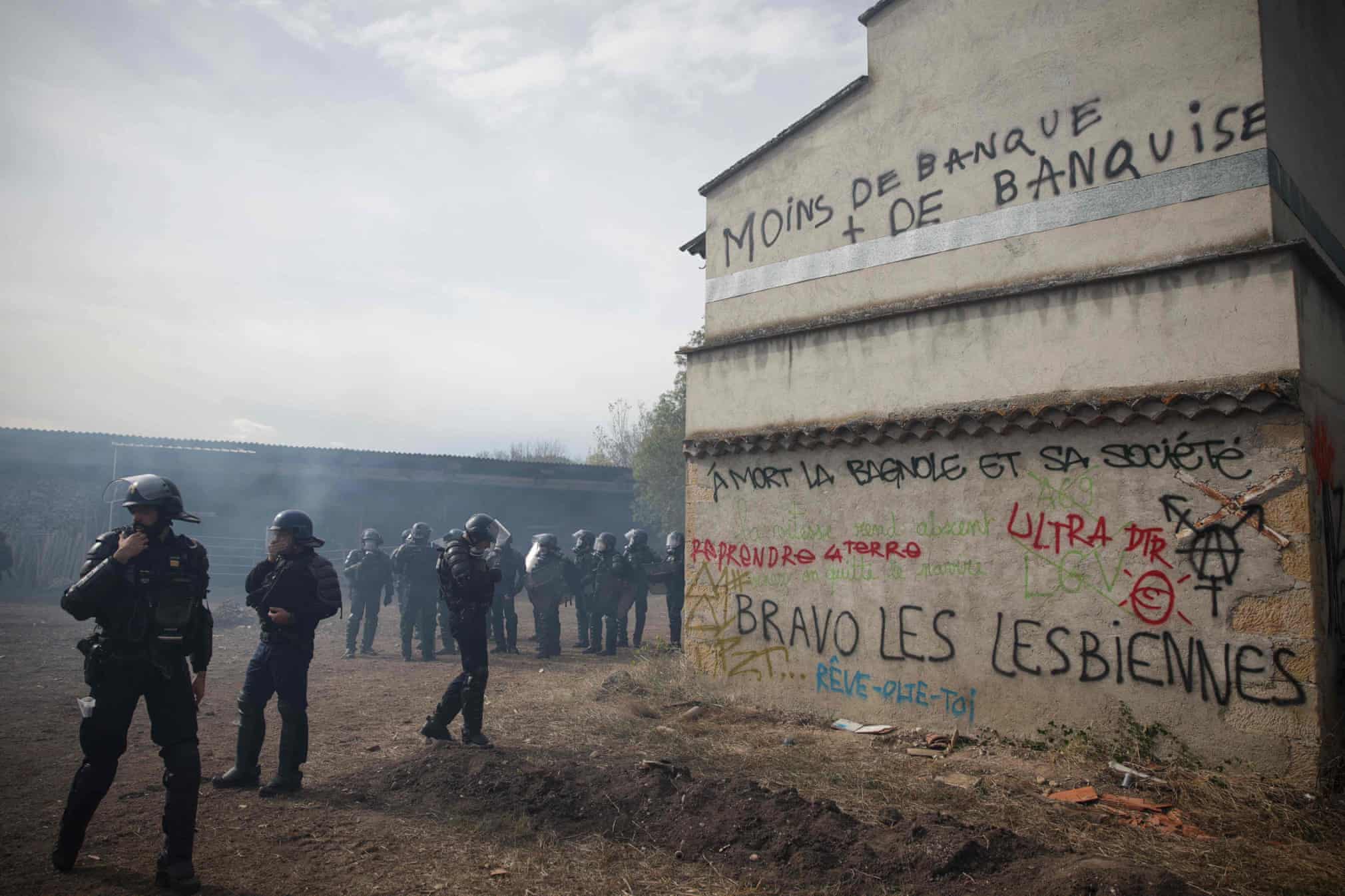 Saix, Pháp - Cảnh sát mặc trang phục chống bạo động đứng gác sau khi giải tán cuộc biểu tình của các nhà hoạt động bảo vệ môi trường phản đối dự án đường cao tốc A69 giữa Toulouse và Castres (Ảnh: Valentine Chapuis/AFP/Getty Images)