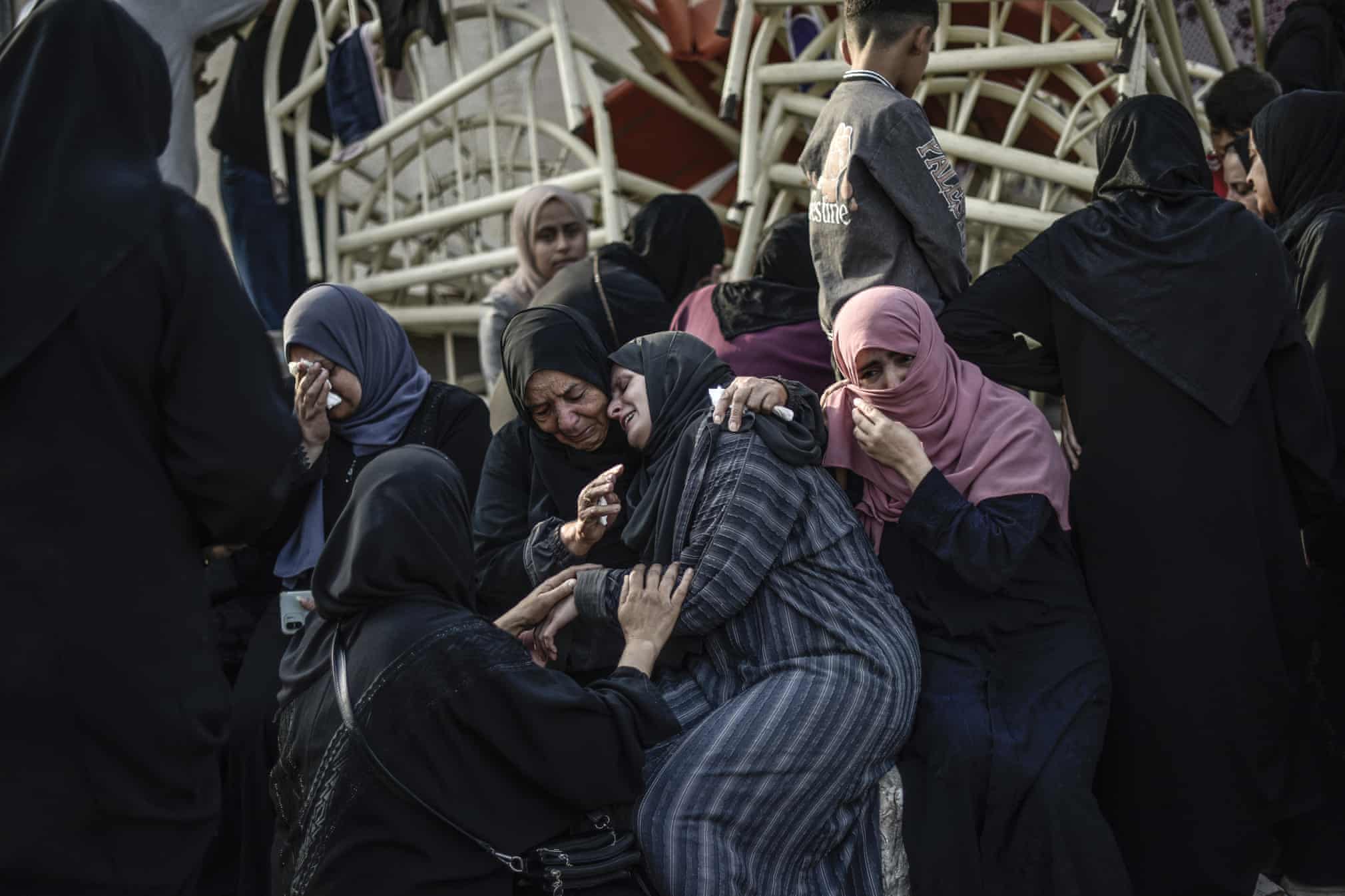 Khan Younis, Dải Gaza - Người dân Palestine khóc thương tại nhà xác bệnh viện Nasser. Họ đến đó để xác định danh tính người thân thiệt mạng trong cuộc không kích của Israel (Ảnh: Abed Zagout/Cơ quan Anadolu/Getty Images)