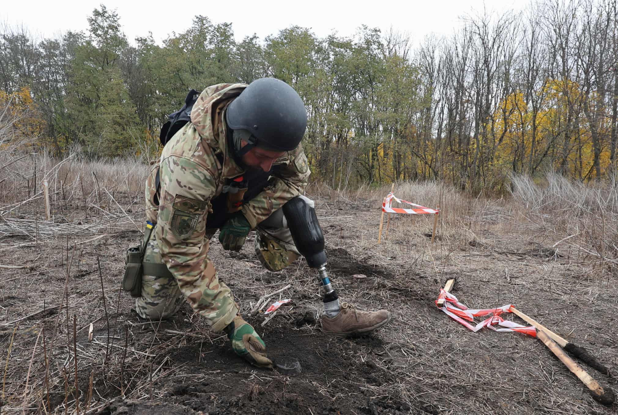 Kharkov, Ukraine - Andriy, thuộc đơn vị đặc nhiệm tổng hợp của sở cảnh sát, đang rà phá bom mìn ở khu vực gần thành phố Kharkiv. Đơn vị tham gia công tác rà phá bom mìn phức tạp nhất. (Ảnh: Sergey Kozlov/EPA)